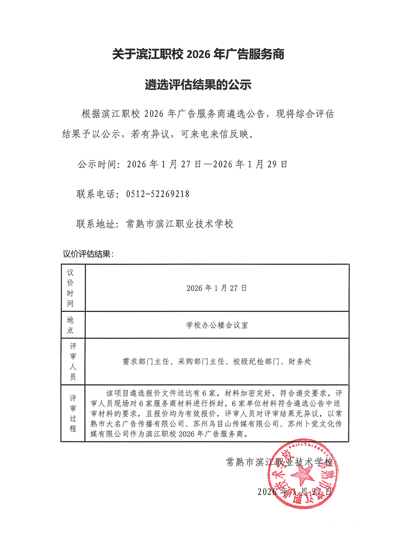 滨江职校2026年广告服务商遴选评估结果公示